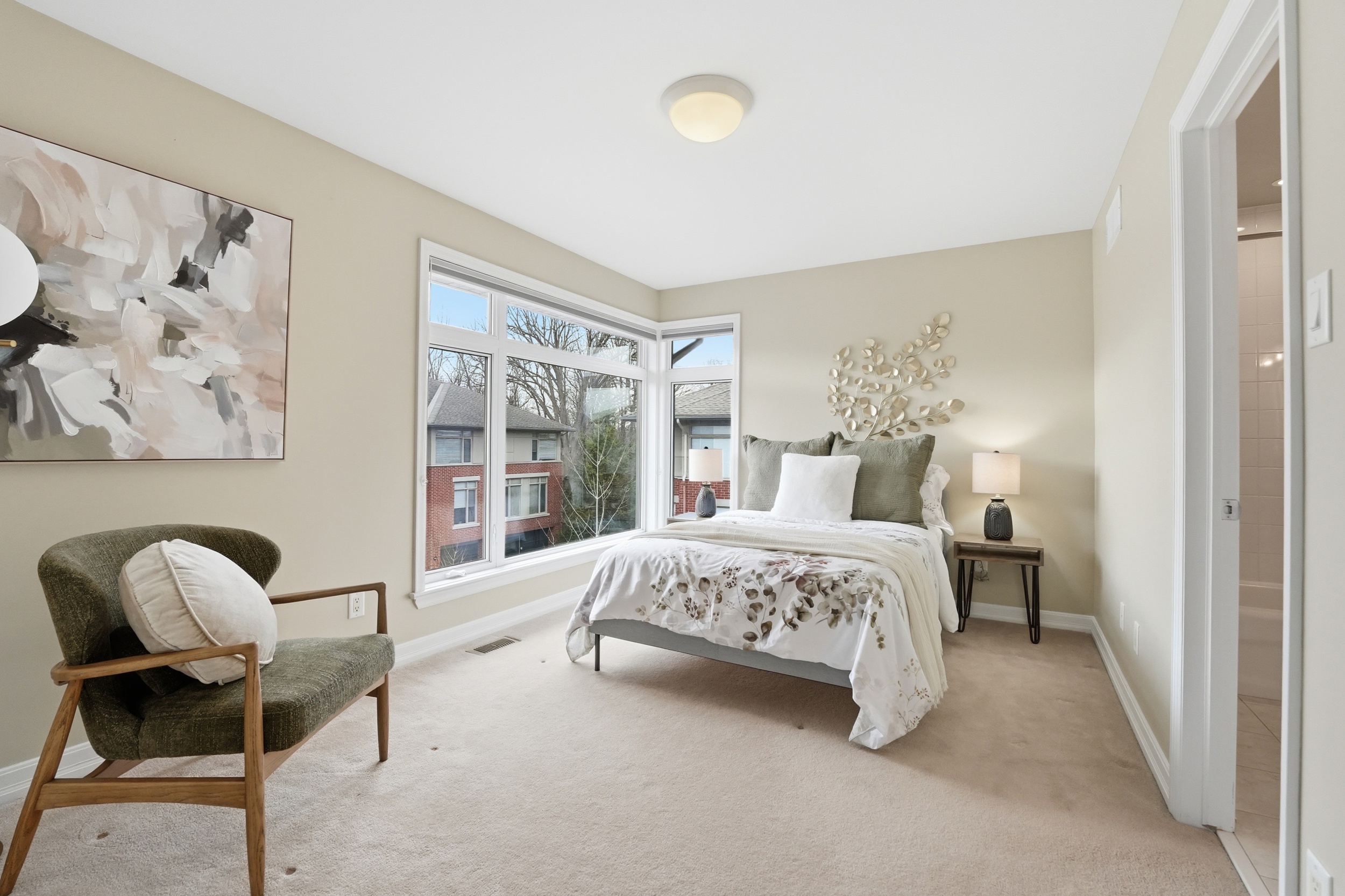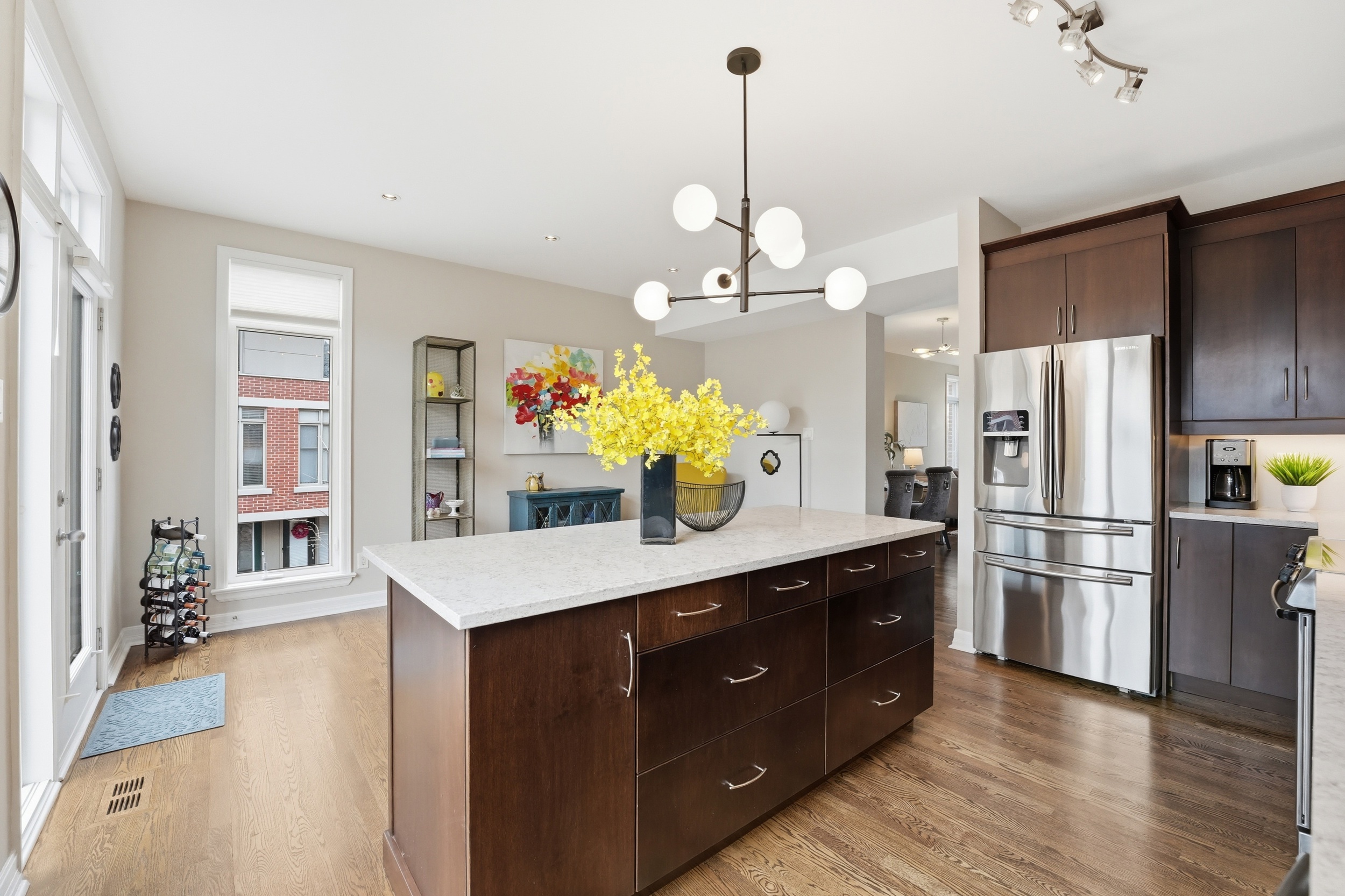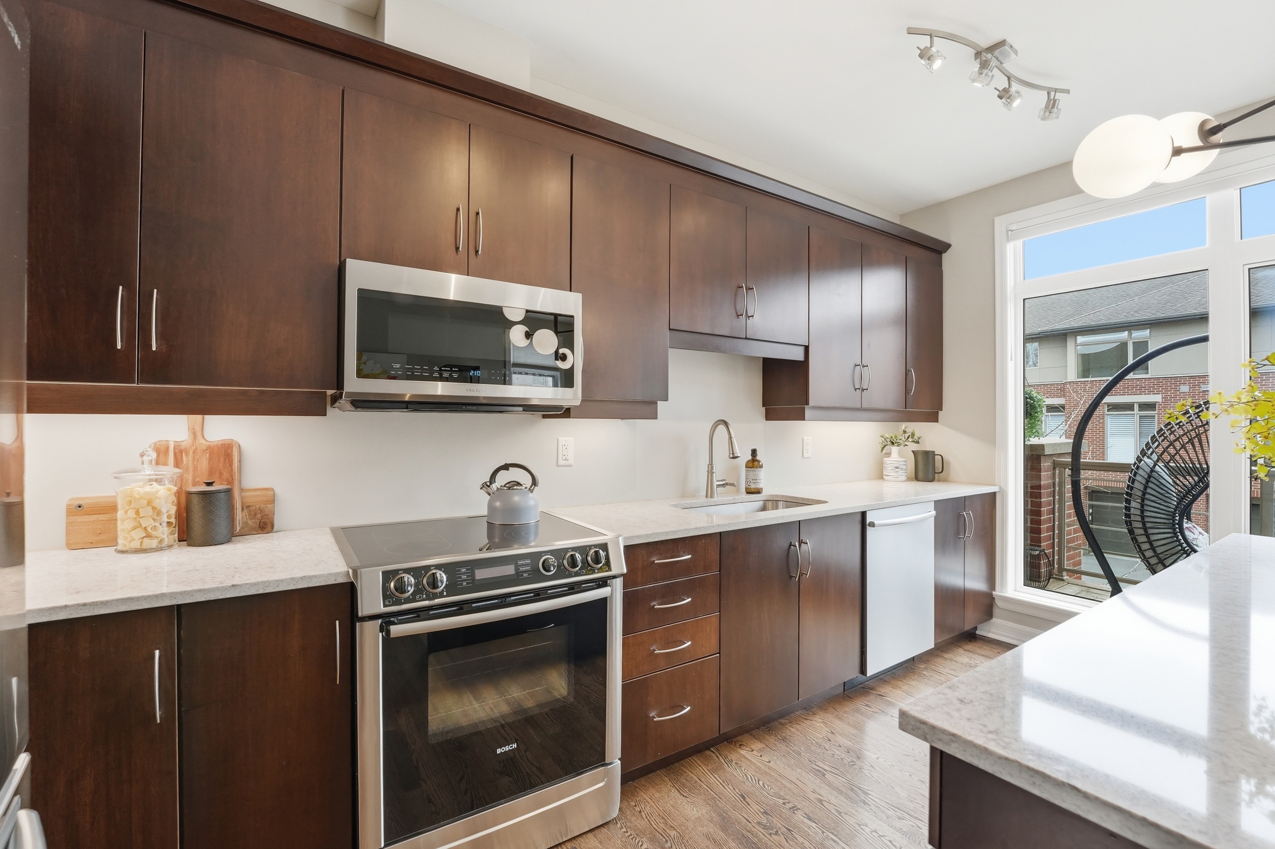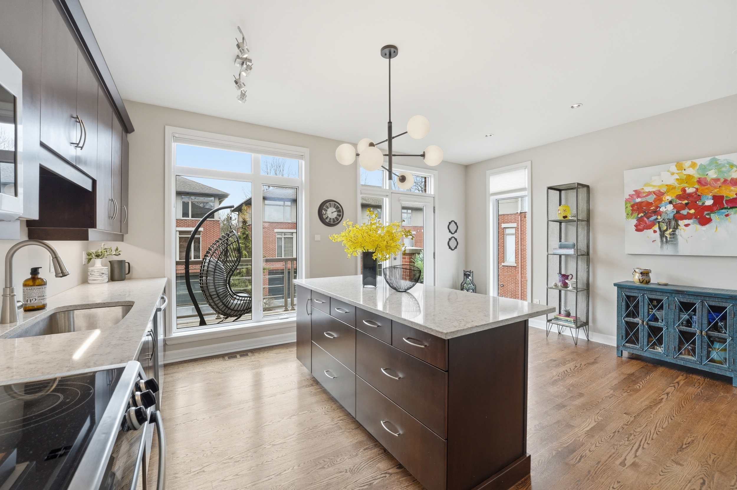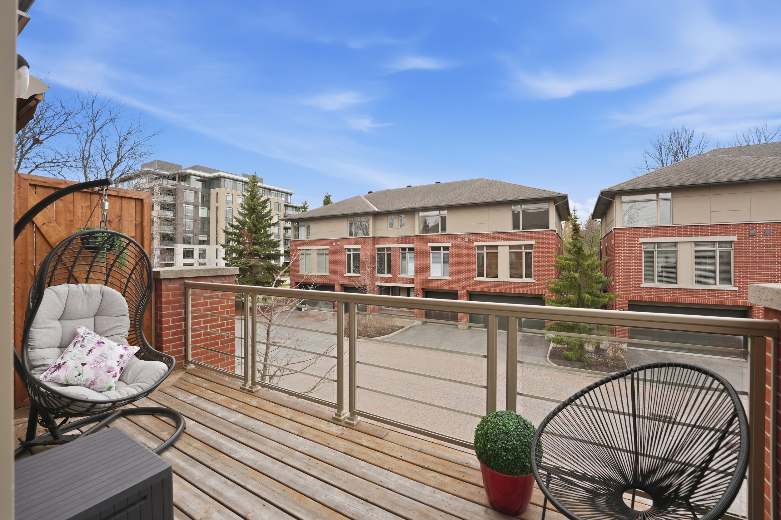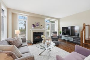 This Uniform-built end unit townhouse, designed by renowned architect Barry Hobin, is set within an exclusive enclave of executive residences in Beaverbrook. Steps to trails with easy access to highway or transit for an easy commute. You immediately notice the natural light-large windows, great exposure, and a layout that just lets the light move through the space. The main floor is where this home really shines. It’s open, functional, and just easy to live in. The kitchen is both stylish and functional, featuring quartz countertops, a large island, ample cupboard space, and access to a spacious balcony. The balcony has a motorized awning and is an ideal spot for your morning coffee! The living and dining areas feature hardwood floors, expansive windows, a hardwood staircase, and a fireplace that anchors the space. Upstairs, you’ll find two spacious, bright bedrooms, each with its own private ensuite. The primary ensuite features a separate tub, large window, double sink, and large shower. The second upstairs bedroom includes its own 3-piece ensuite, making it ideal for guests, family, or shared living. The first floor provides for a 3rd bedroom, a great office or other flex space. The floor also hosts a finished powder room. An unexpected double car garage is a rare bonus, adding even more appeal to this unique home.